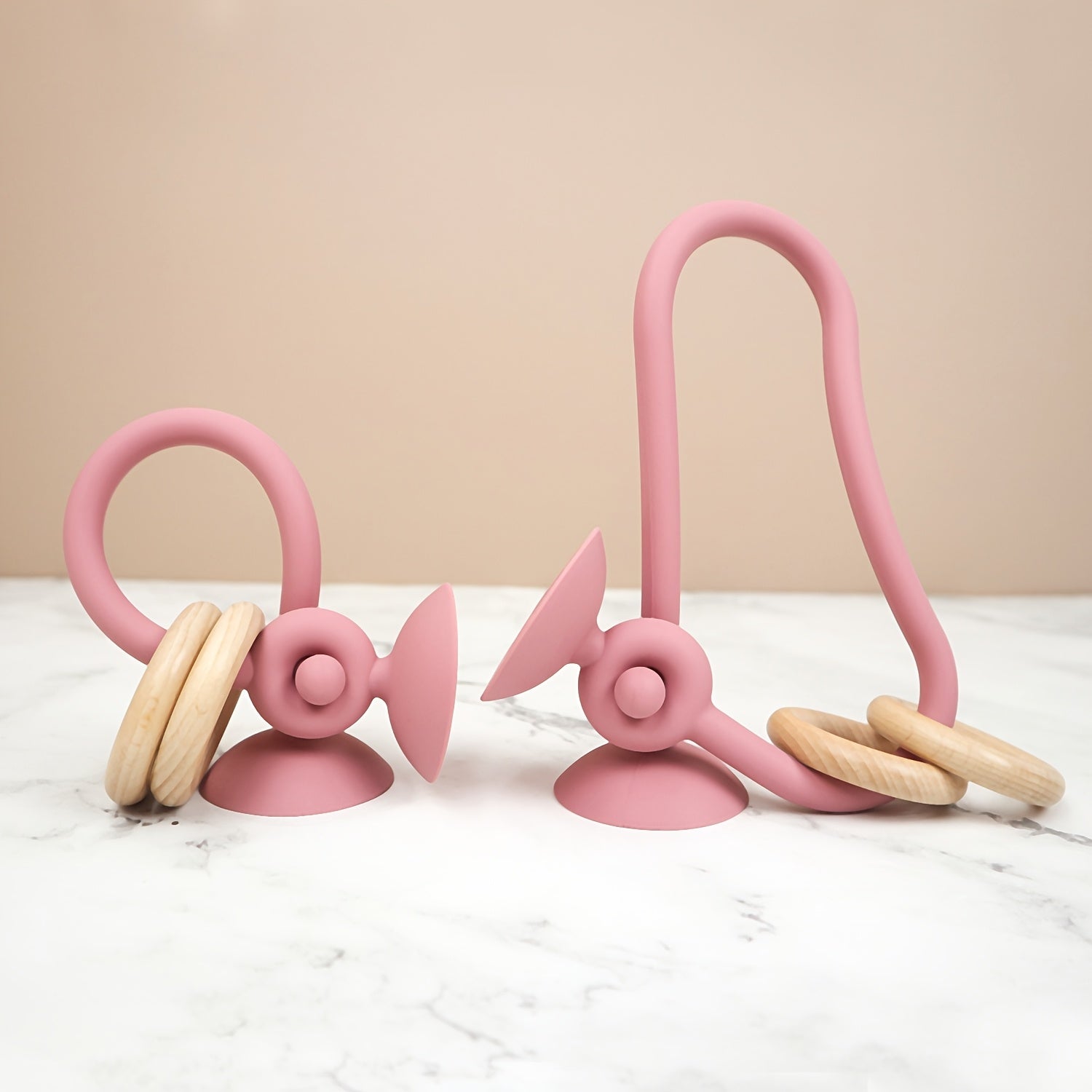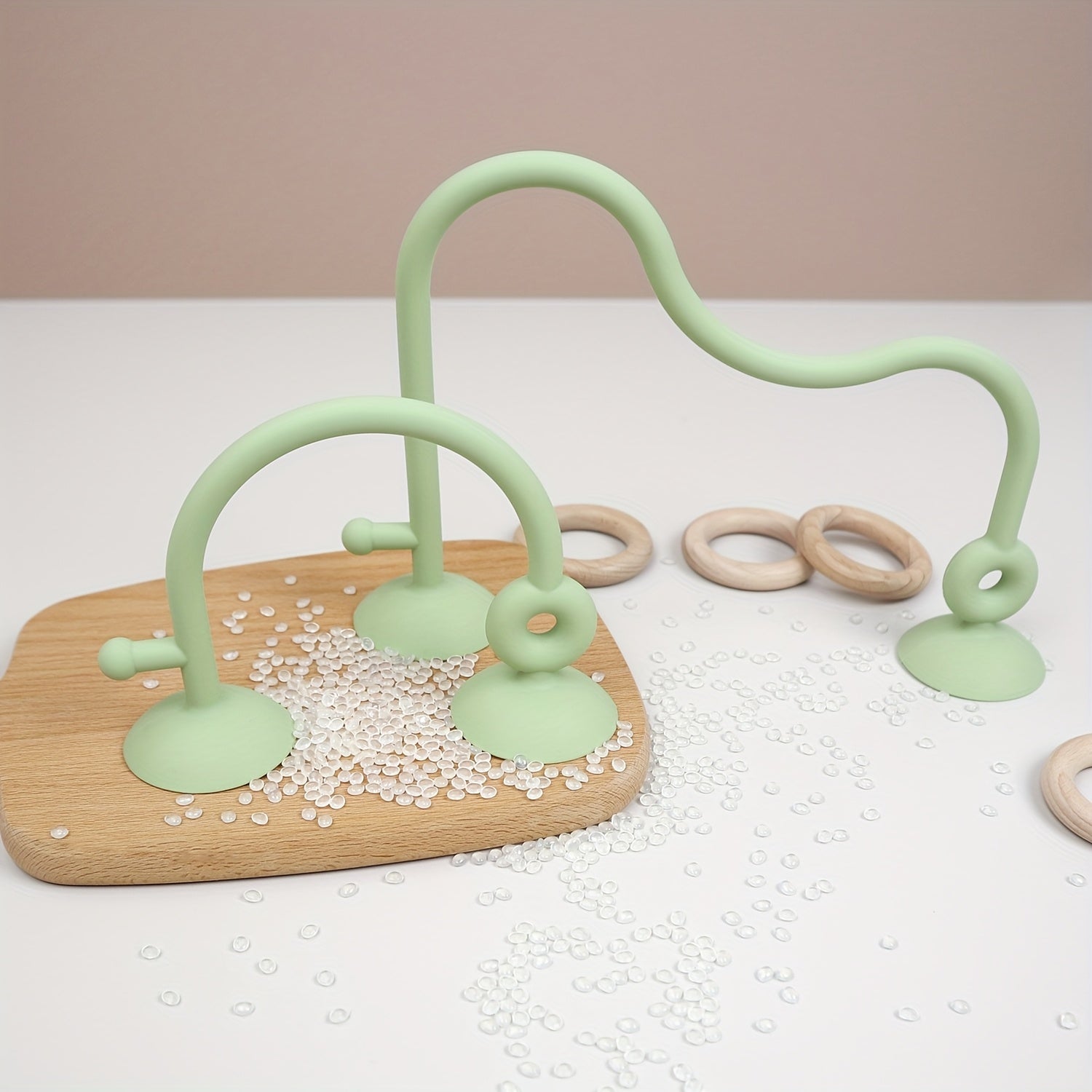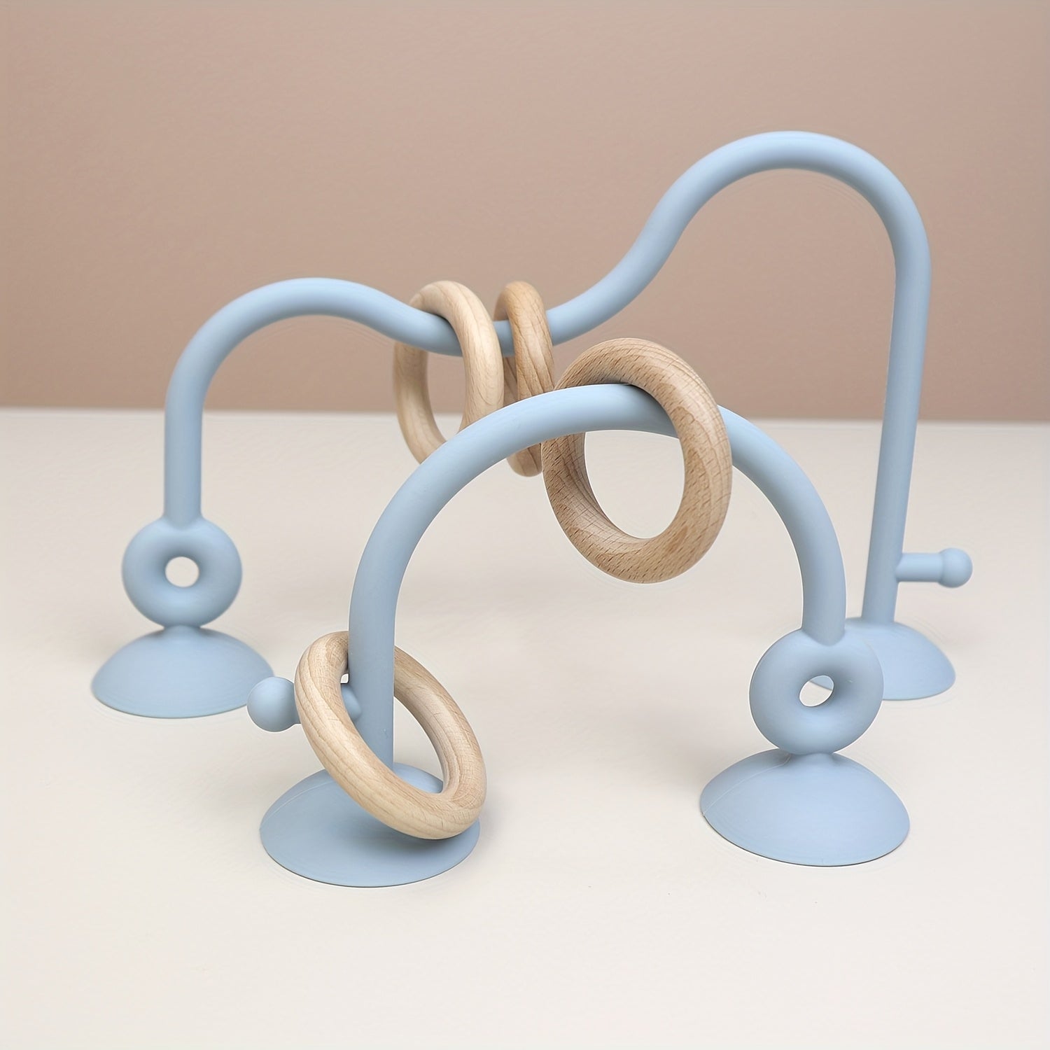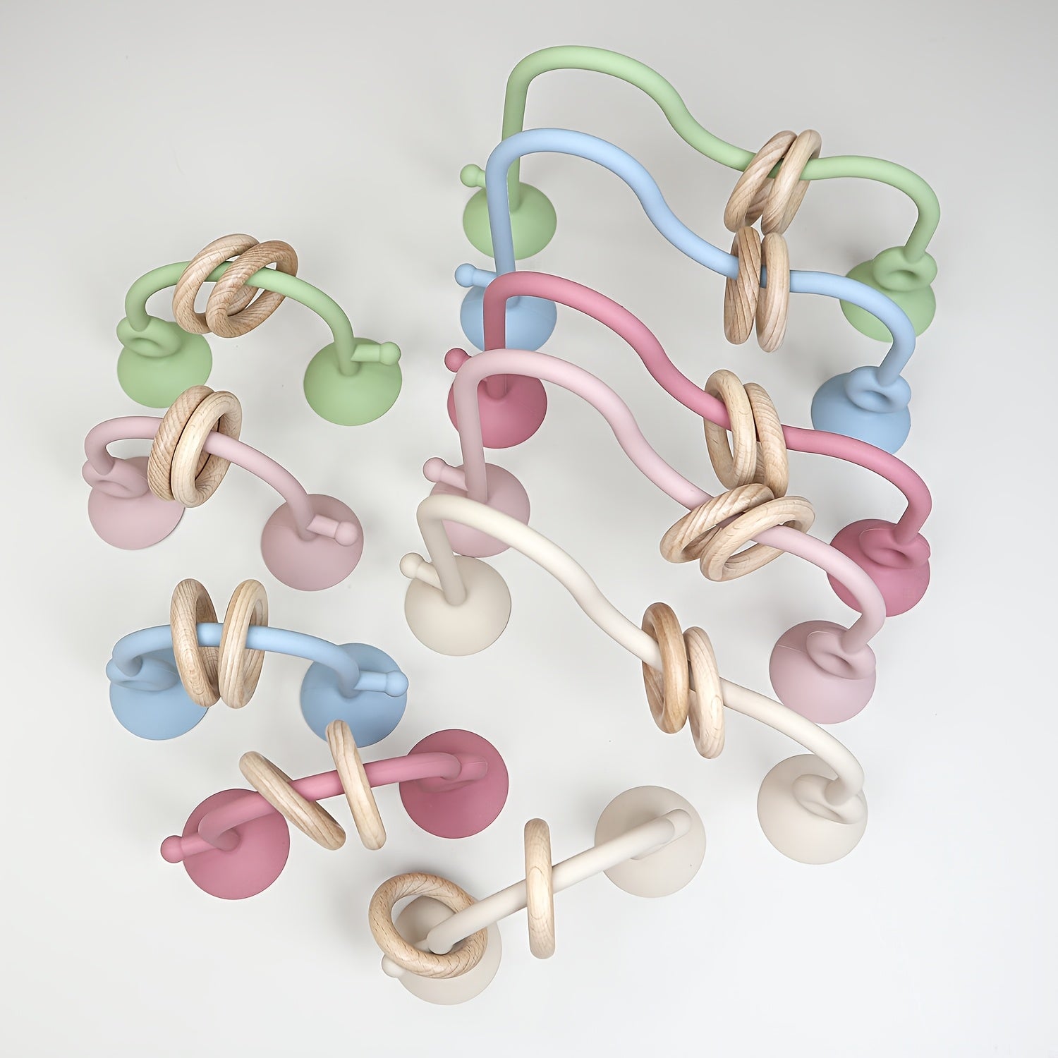Développement Sensoriel et Moteur : Les anneaux de bois naturel, faciles à saisir et à manipuler, encouragent la motricité fine et la coordination œil&main. Les textures (bois lisse, silicone souple) sollicitent le toucher.