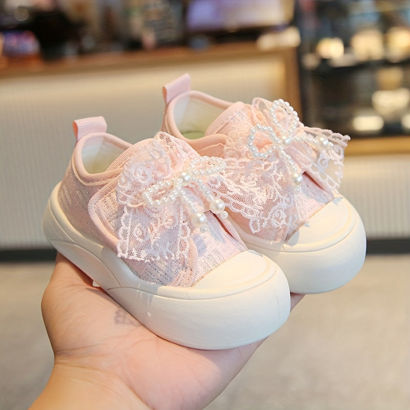 Chaussures Toile Bébé Fille Élégantes avec Nœud en Dentelle et Perles