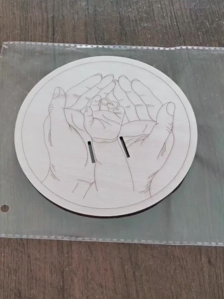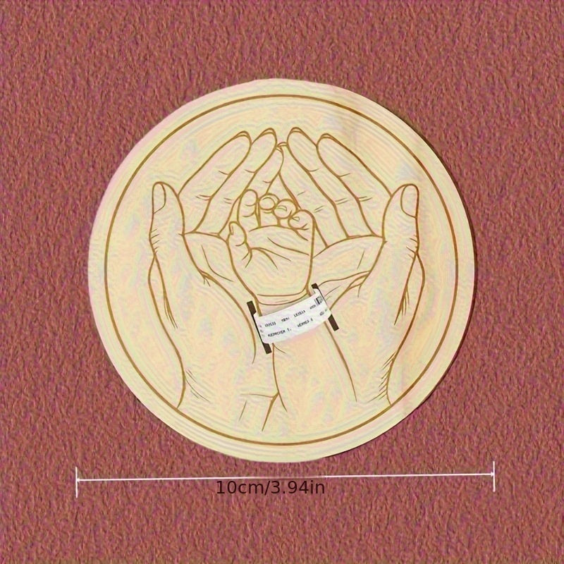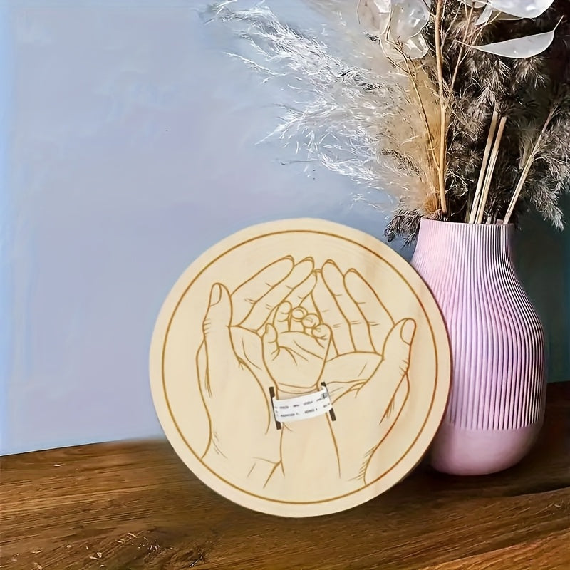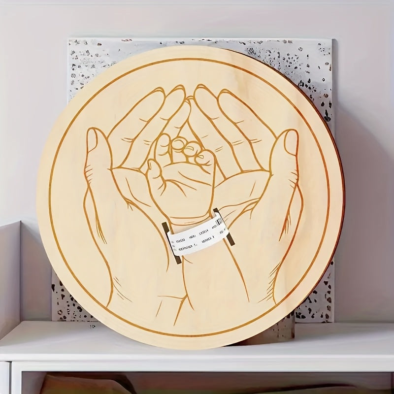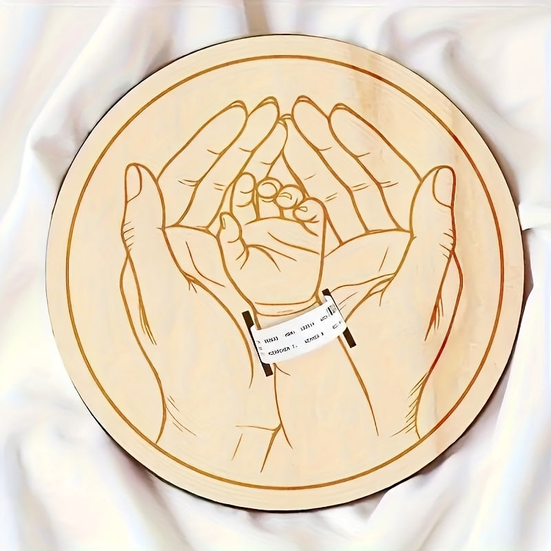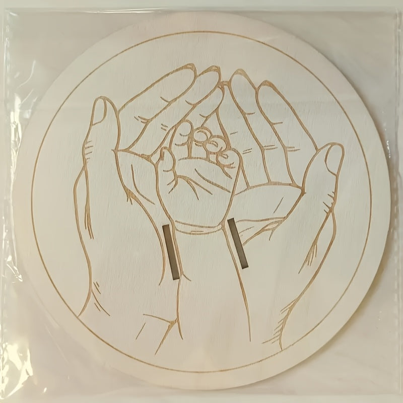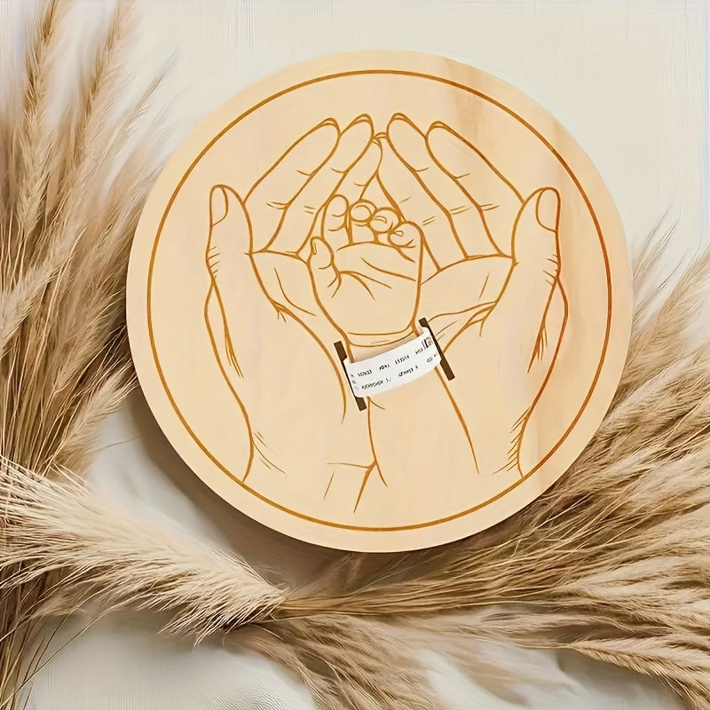 Ce magnifique cercle en bois est gravé d'un dessin symbolique et touchant : les mains d'un parent tenant délicatement la minuscule main de son nouveau-né, avec le bracelet de naissance authentique placé au centre.