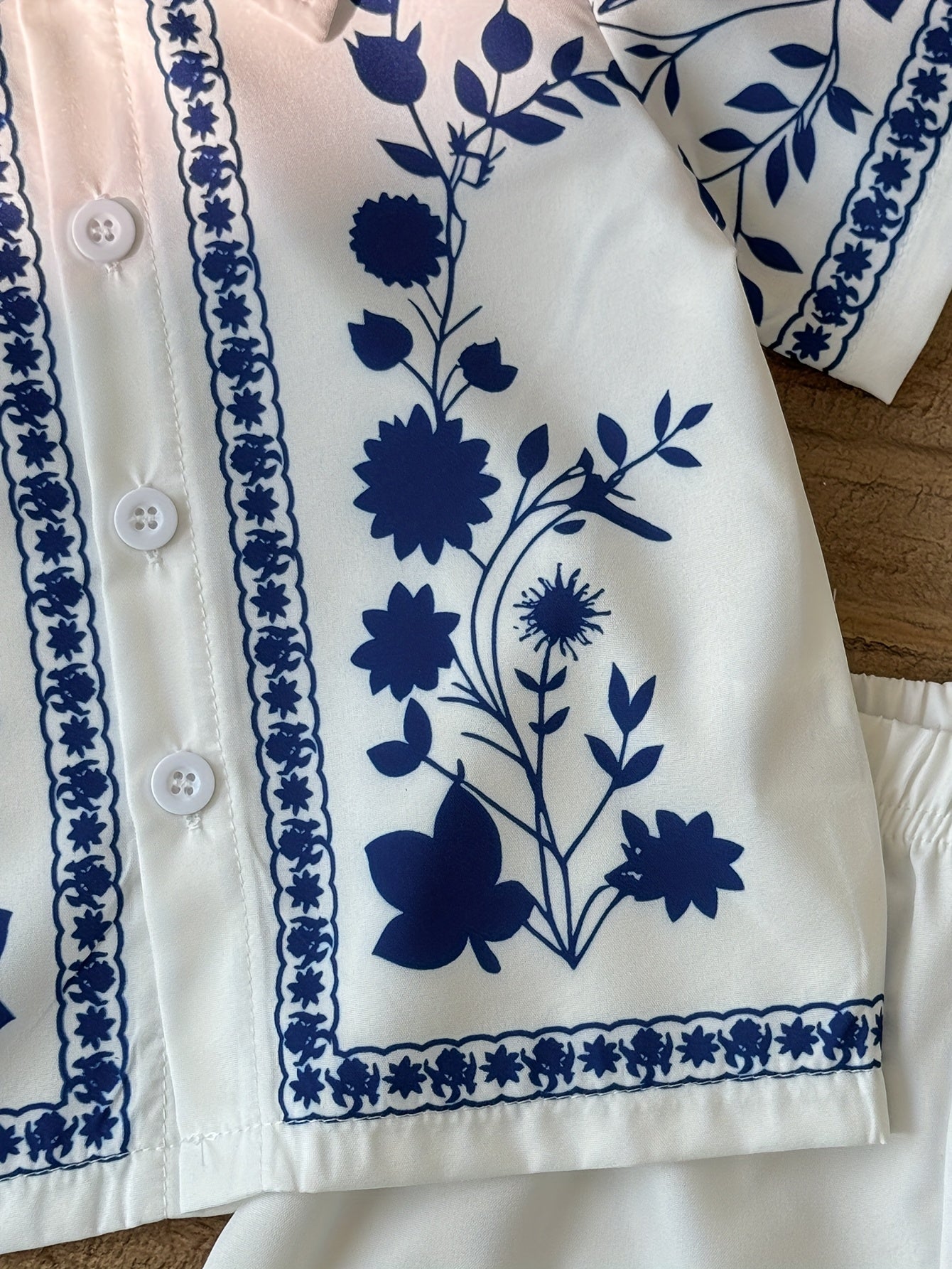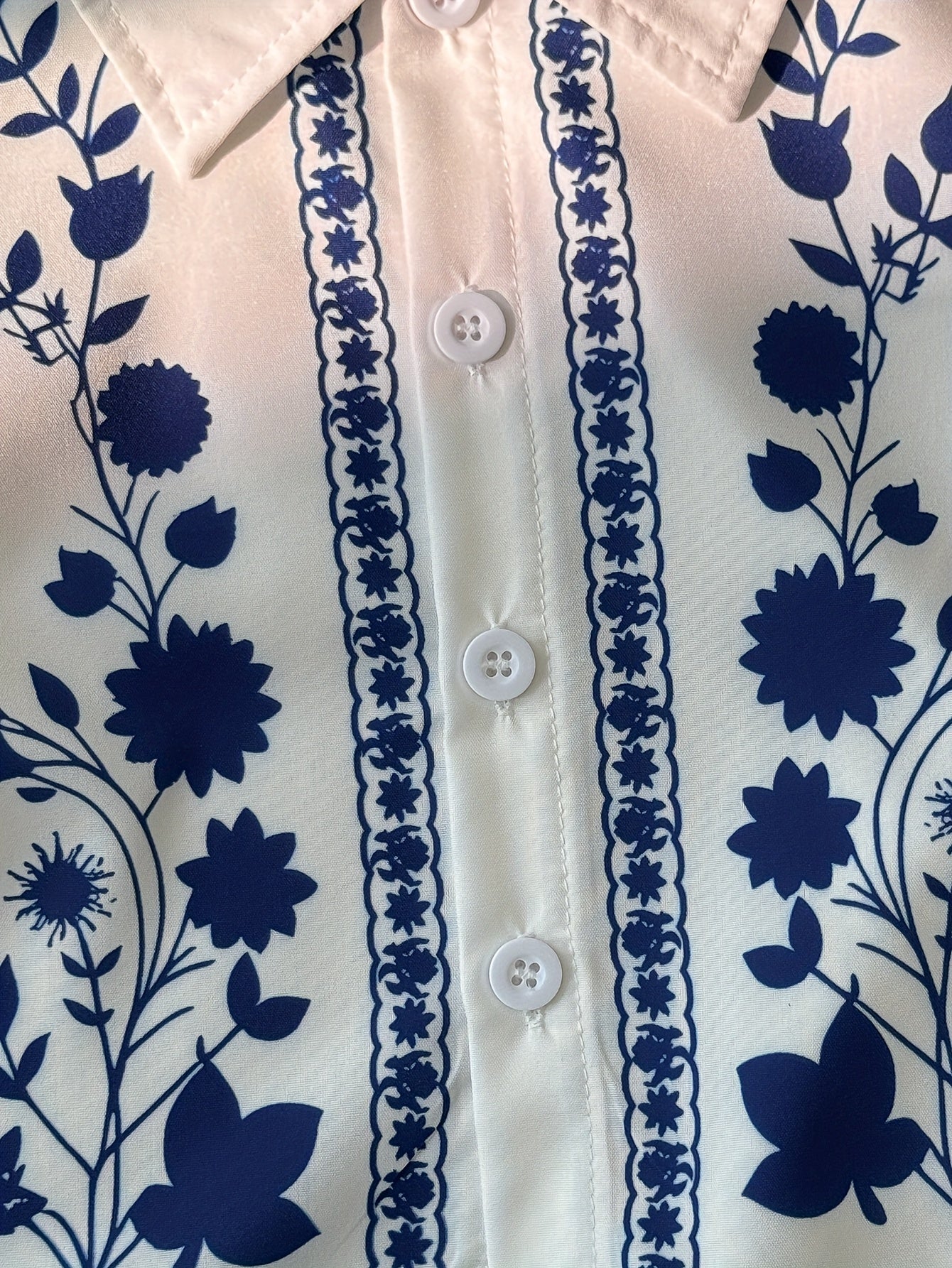 Chemisette à Manches Courtes : Coupe confortable et décontractée. Le tissu blanc est orné d'un magnifique motif floral bleu indigo, couvrant le corps et les manches. Le col classique et la patte de boutonnage sont soulignés par une bordure décorative assortie.